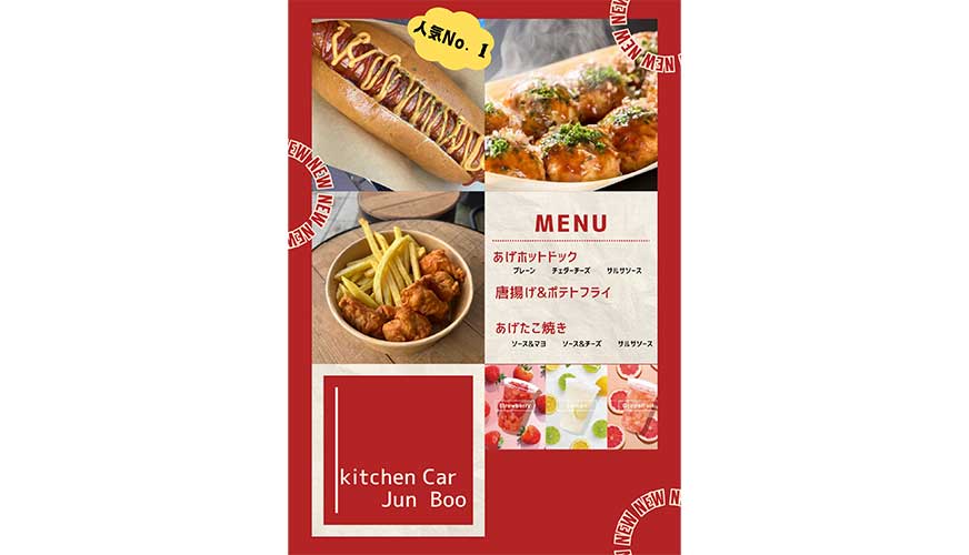 ボリューム満点あげホットドッグやお子様大好きポテトフライなどメニュー豊富なキッチンカーです。